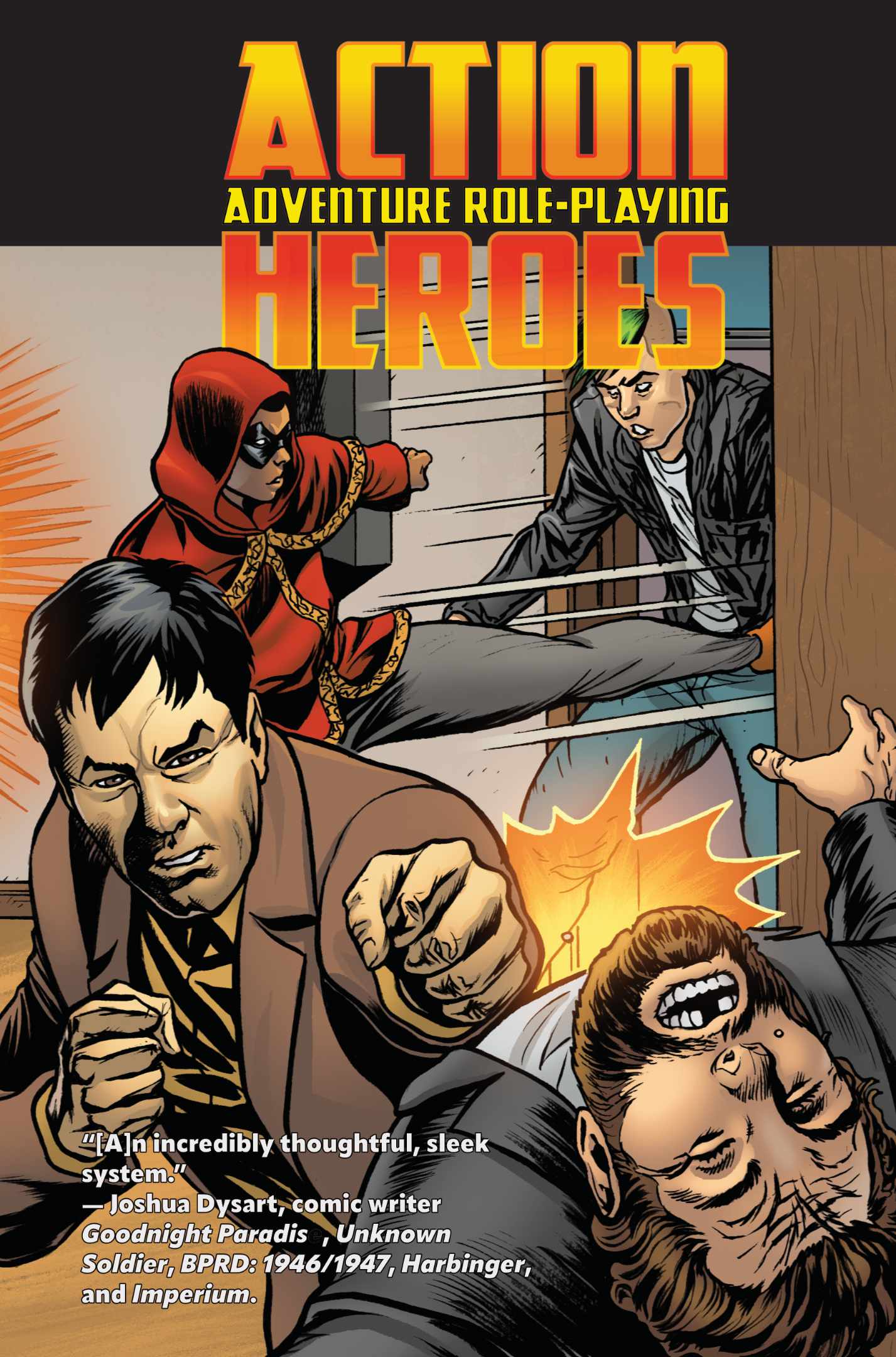 Action-Heroes is a cinematic toolkit role-playing game that gives gaming groups the tools to play larger than life characters doing explosive actions that root them as the center of their world.